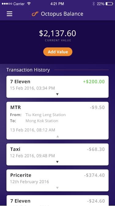 The user can see a historical feed of their transactions. They can see what they purchased, and when and where they engaged with the Octopus card.