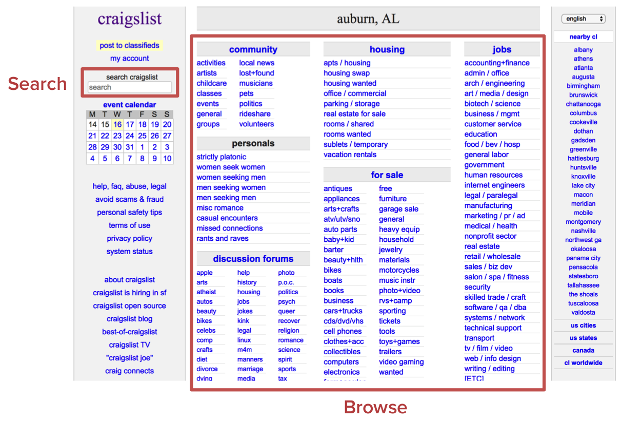 CraigsList is a great example of the Browse + Search UX pattern:
